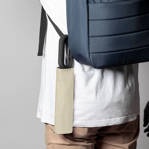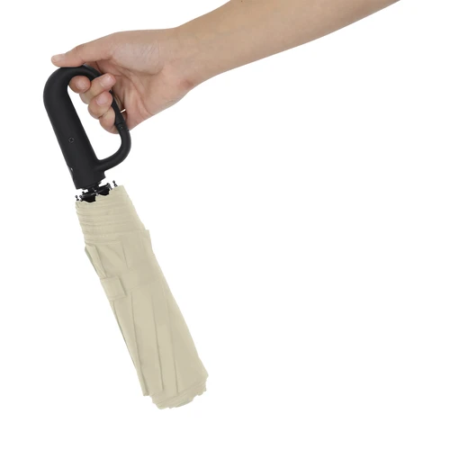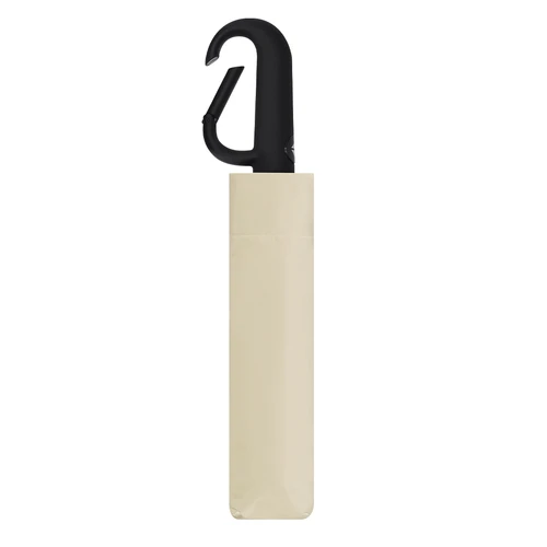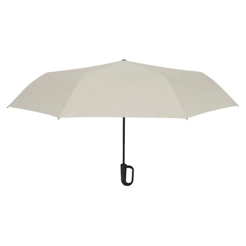 Paraguas plegable de 8 paneles en RPET. De 100cm de diámetro, apertura y cierre automático, con sistema antiviento y en resistente material pongee. Con varillas de fibra de vidrio en color negro, cierre de velcro y mango ergonómico con mosquetón de enganche integrado. Presentado en funda individual a juego. Incluye distintivo logo RPET.