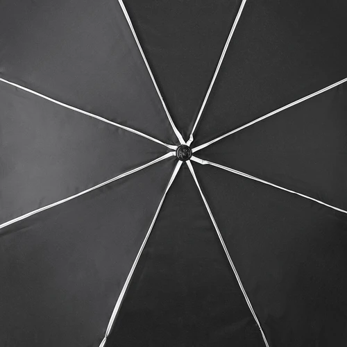 Paraguas antiviento fabricado en RPET 190T de 8 paneles, con elegante diseño en color negro con ribetes reflectantes. De 120cm de diámetro, con apertura automática y en resistente material pongee. Con varillas en fibra de vidrio en color negro, cierre de velcro y mango en PP. Incluye funda con correa ajustable para fácil transporte y distintiva etiqueta RPET.