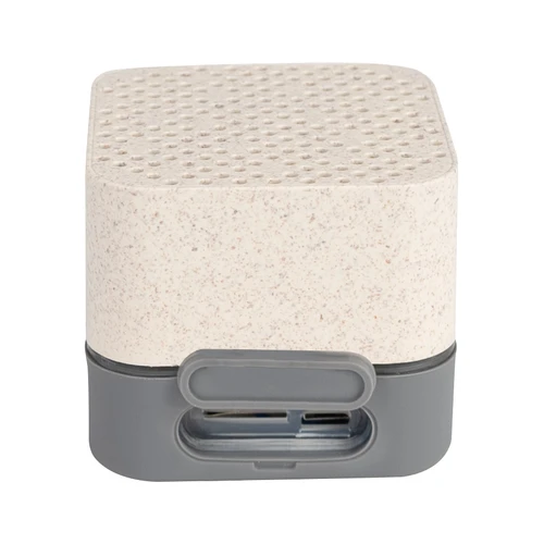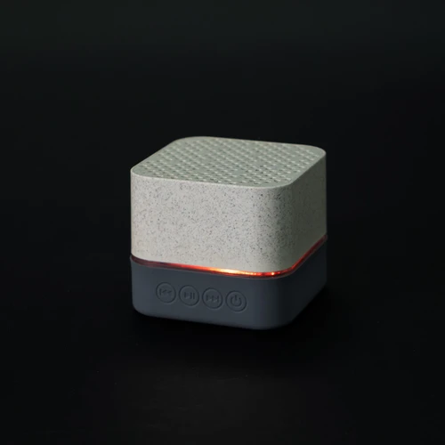 Parlante altavoz de caña de trigo (wheat straw) "LIFE" con juego de luces LED y sección inferior de silicona gris con funciones.