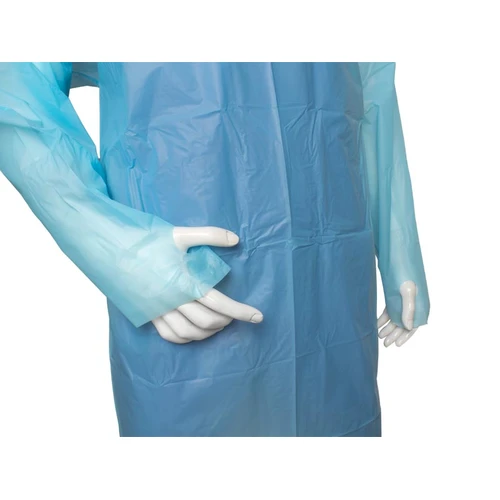 Pechera desechable manga larga, espalda abierta, en plástico PEVA impermeable de 27g/m2, muy liviana, lo que la hace respirable cuando se usa. Para uso quirúrgico, transporte e industrial. Proporciona protección de fluídos líquidos y gaseosos, polvo en suspensión, sustancias dañinas, virus y bacterias. Contiene protección para palma de mano, con orificio para dedo pulgar. Se recomienda usar encima de la ropa de vestir.