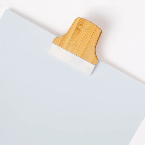 Pinza porta notas fabricada en bambú. Con potente imán para poner en superficies metálicas, de diseño bicolor en blanco y madera bambú. Presentado individualmente en una bolsa. Materiales como el bambú fomentan la utilización de materias primas naturales, reduciendo las emisiones contaminantes. Proviene de una planta de gran resistencia y versatilidad, con crecimiento y regeneración rápidos, siendo una excelente alternativa al uso de madera tradicional.