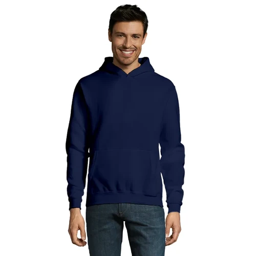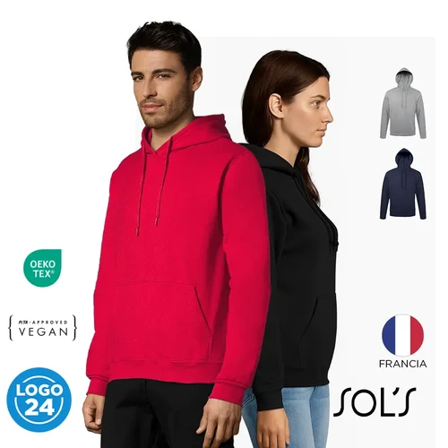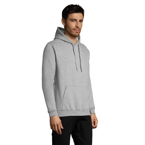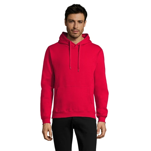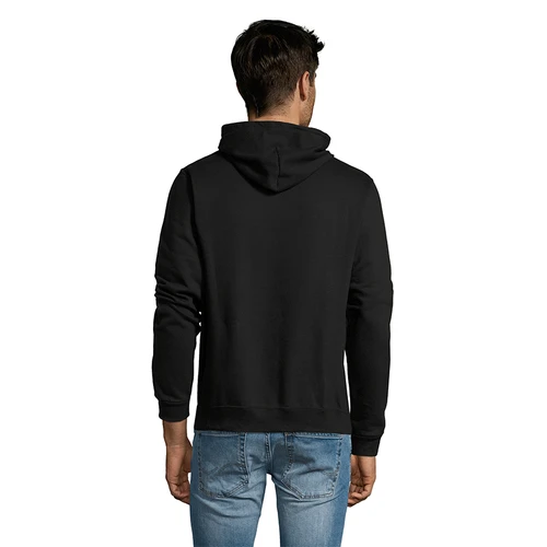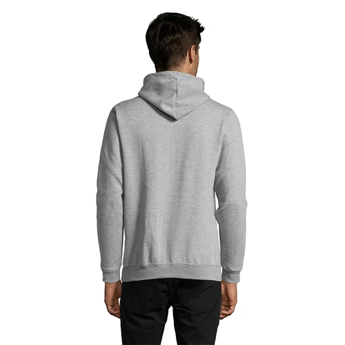 Polerón de frisa 50% algodón y 50% poliéster de 280g tipo canguro unisex con capucha.