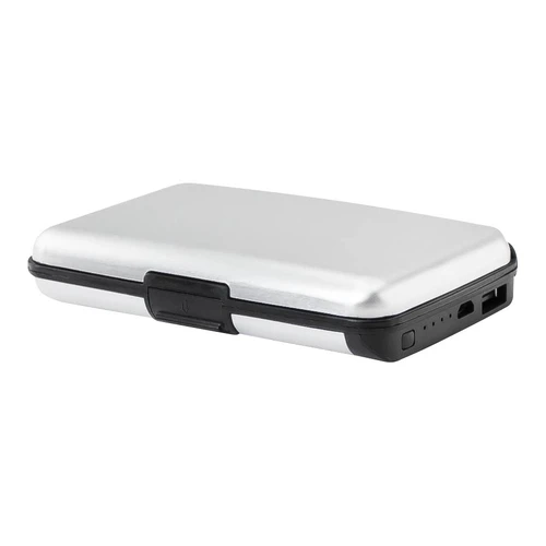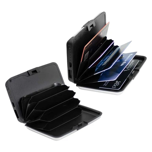 Estuche rígido Porta-Tarjetas (tamaño Tarjeta de Crédito) con protección anti-clonación o Escaneo RFID. Capacidad interior para 6 Tarjetas. Incluye cargador de celular Power Bank de 2.500 mAh, con indicador de carga y cable USB/Micro USB. Presentación en bolsa de polipropileno y Estuche plateado de Regalo.
