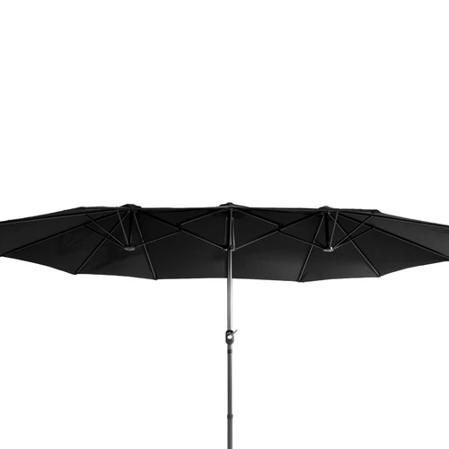 Quitasol ovalado doble de 4.55 x 2.7 m, modelo "Twins", con 12 cascos de lona Poliéster UV impermeable de 180g. Contiene varas reforzadas de Acero recubierto de 12 x 18mm, asta de Acero recubierto de 48mm, sistema de apertura automático con manivela.