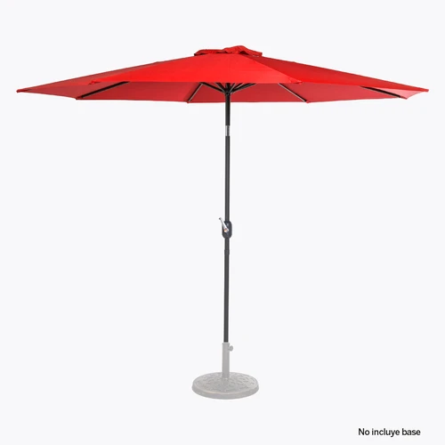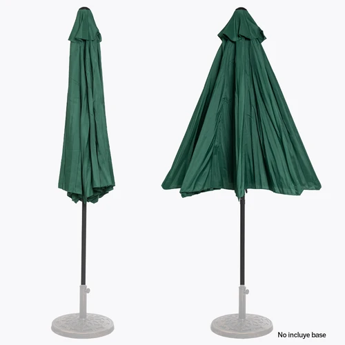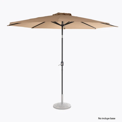 Quitasol redondo de Ø3m, modelo "Shake", con 8 cascos de lona Poliéster UV impermeable de 160g. Contiene varas reforzadas de Acero recubierto de 12 x 18mm, asta de Acero recubierto de 38mm, sistema de apertura automático con manivela y codo giratorio de 45°. No incluye base.