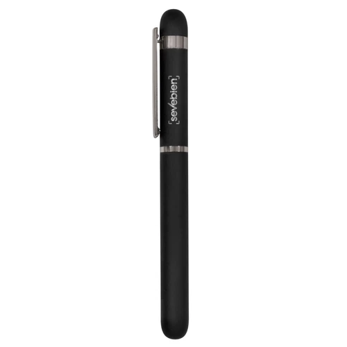 Metal. Cuerpo de aluminio. Roller. Apertura con tapa a presión. Clip y anillos metálicos color plata. Tinta Azul. Destape electroplateado en ambas partes. Presentación en estuche con cierre magnético.