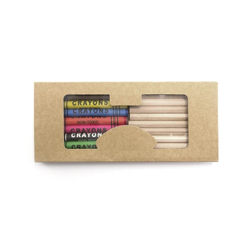 Set de 19 piezas en estuche con cuerpo en cartón natural con ventana y bandeja interior. Contiene ceras de cuerpo cilíndrico y lápices de madera natural de cuerpo hexagonal en variados colores.