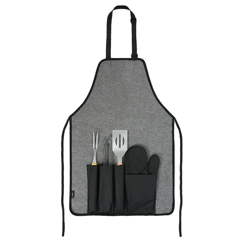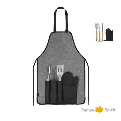 Set parrillero con delantal, espátula, tenedor, pinza y guante. El delantal de policanvas cuenta con compartimientos para guardar los utensilios fabricados en acero inoxidable 420, madera y poliéster. Incluye espátula de 36 cm, tenedor de 35 cm, pinza de 36 cm y un guante resistente al calor. Ideal para hacer asados cómodamente, con todo ordenado y fácil de llevar para las parrilladas y juntas al aire libre.
