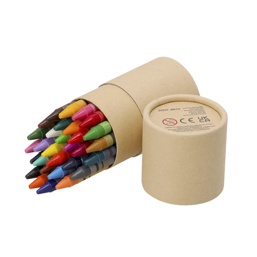 Set de ceras 30 piezas en estuche cilíndrico de cartón natural. El Cartón Reciclado proviene del reaprovechamiento de excedente de fabricaciones y reciclaje de papel en el final de su vida útil, convirtiéndose en un lienzo ecológico y sostenible.