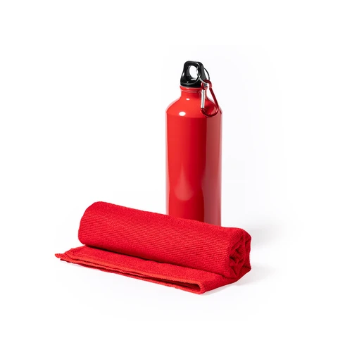 Set de bidón y toalla a juego. Incluye: Bidón de 800 ml de capacidad con cuerpo en aluminio de acabado brillo. Con tapón de seguridad a rosca y mosquetón metálico de transporte. Toalla absorbente fabricada en microfibra de 160g/m2 y tamaño 40x90 cm. Set disponible en variada gama de colores y presentado en caja de cartón con colores a juego.