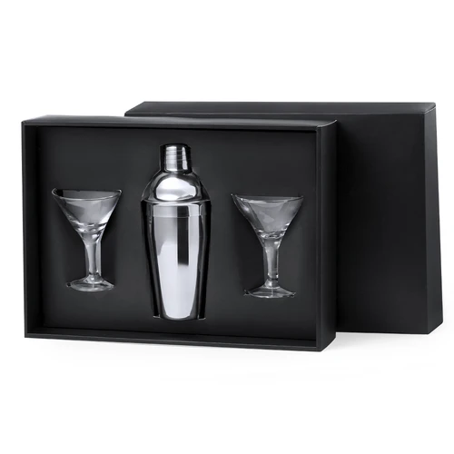 Elegante set de coctel. Conjunto de coctelera en acero inox de 550 ml para preparar las mejores mezclas de bebidas. Además, contiene 2 copas de cristal de 150 ml cada una y de elegante diseño triangular, para una presentación exquisita. Presentado en caja negra.