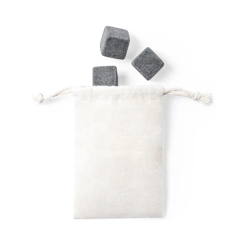 Set de 4 cubitos reutilizables. Fabricados en piedra natural esteatita, también conocida como piedra o roca de jabón, que mantiene la bebida fría sin alterar sus propiedades al no diluir su contenido en agua, además de mantener el sabor original de la misma. Presentados en funda de algodón con cordón de cierre.