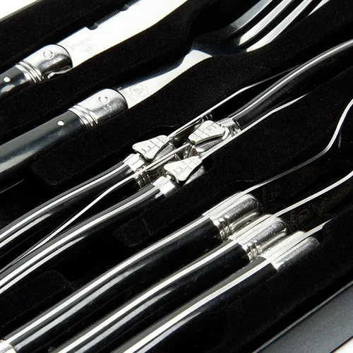 Set de 8 cubiertos, incluye 4 cuchillos y 4 tenedores. Hojas de acero forjado 420 y mango ABS con detalles metálicos. Medidas de la caja: 28cm x 18cm x 3cm. Producto libre de BPA. Laguiole.