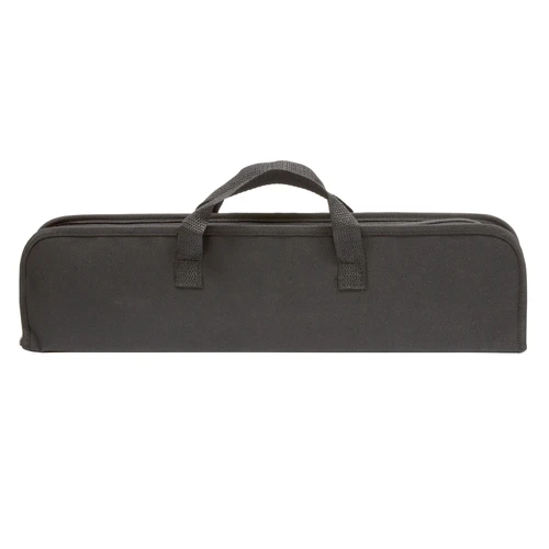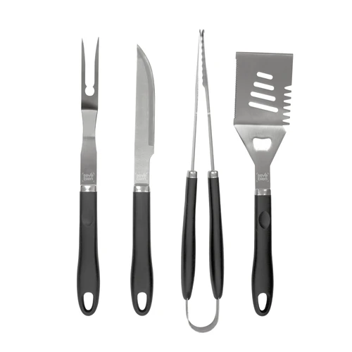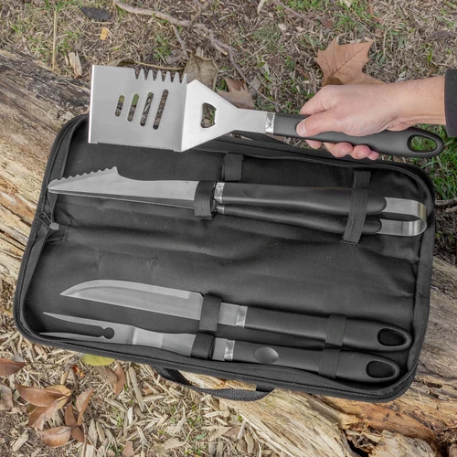 48 x 12,2 x 5,5 cm (estuche cerrado). Acero inoxidable 420. Set de 4 utensilios: tenedor y cuchillo de 41 cm, pinza de 44,5 cm y espátula de 40 cm de largo, todos con mango plástico en color negro. Estuche de nylon 600 D color negro con cierre. Calidad Premium.