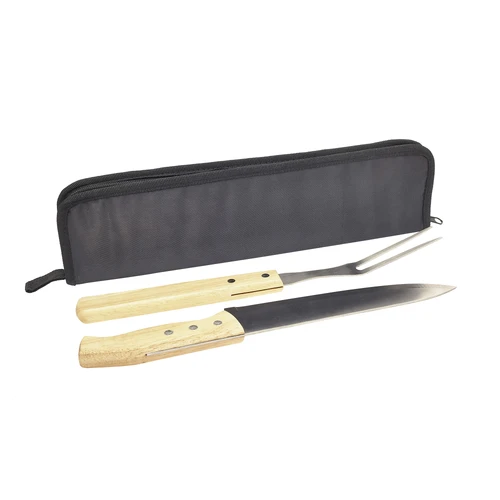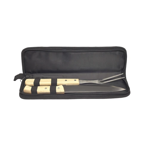 9,5 x 35,5 (estuche cerrado) 20 x 35,5 (estuche abierto). Tenedor: 33 cm y cuchillo: 32,5 cm. Acero inoxidable y madera + Poliéster. Set de cuchillo y tenedor con mango de madera. Estuche de poliéster con cierre. Presentación en caja de regalo.
