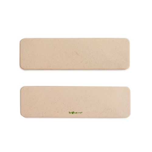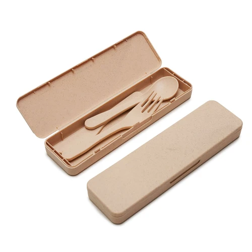 Set de cubiertos de PP y Wheat Straw, pasta de tallo de trigo, un material sustentable que reduce el consumo de plásticos vírgenes. Incluye: tenedor, cuchara, cuchillo y contenedor.
