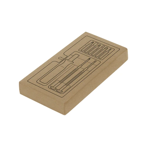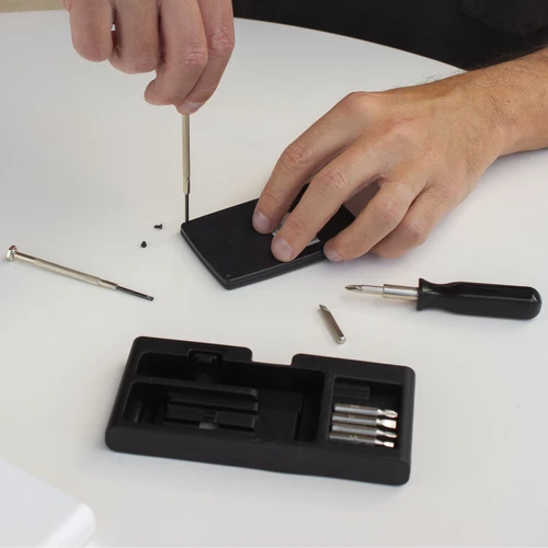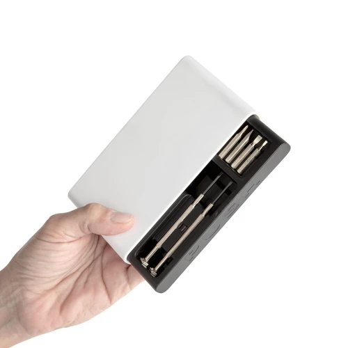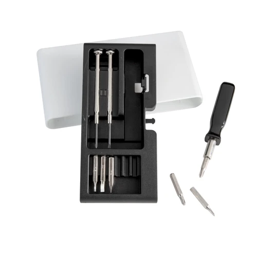 Todas las puntas en un solo estuche.Set de destornilladores. Incluye: 1 mango con punta imantada, 6 puntas diferentes (3 planas: 1,5 ; 3 y 4 mm. y 3 cruz: 0000, 0 y 1mm.) y 2 destornilladores de precisión (1 plano y 1 cruz). Base imantada que permite mantener ordenadas las diferentes puntas. Apertura push. Medidas: 7,3 x 13,7 x 2,1 cm.