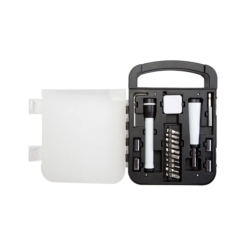 22 x 16 x 2,5 cm. Plástico. Set de herramientas de 19 piezas. Contiene: linterna, cinta metrica, multi desarmador con juego de 10 puntas (4 phillips, 2 planas, 3 hexagonales y 1 adaptador para acople). Acople para llave tubo 7, 8 , 9 y 10 mm y llave allen. Presentación en caja de regalo.