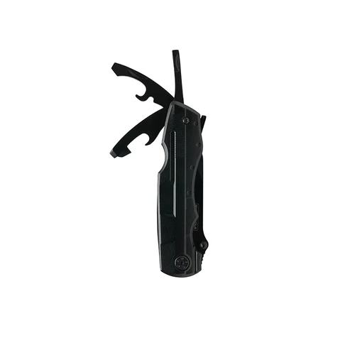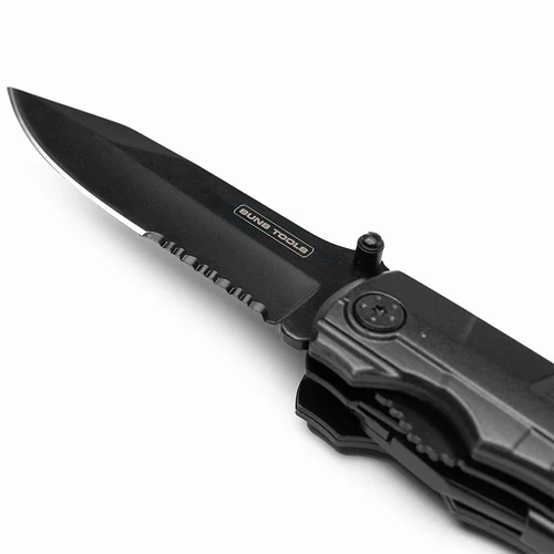 Multi herramienta de acero inoxidable de 8 funciones. Incluye juego de 9 cabezales y funda. Cuenta con pinza, navaja y destornillador con cabezales intercambiables. Medidas: 4,3 x 14,3 x 15,5 cm. Suns Tools.
