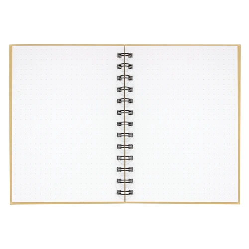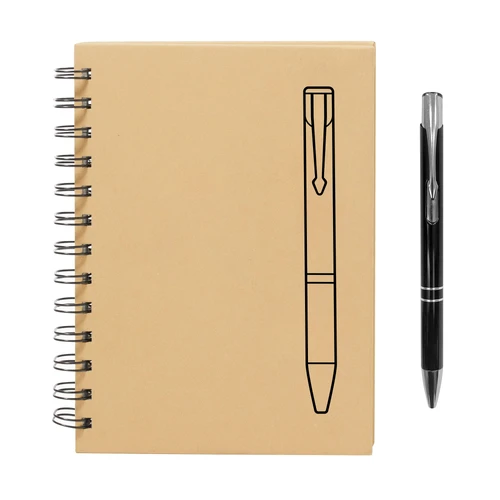13 x 18 cm. Libreta color Kraft, anillado metálico y 70 hojas punteadas de 70g. Bolígrafo metálico (BP295) color negro con tinta negra. Mediante sistema de imanes el bolígrafo queda sujetado a la tapa, causando un efecto sorprendente.