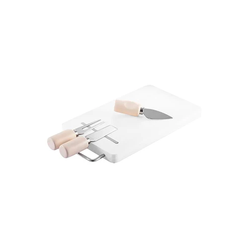 Cheese Set con 3 prácticas herramientas para quesos + tablero de madera de Hevea (Rubberwood). Incluye banda magnética sobre la tabla, para fijar las herramientas a ella.