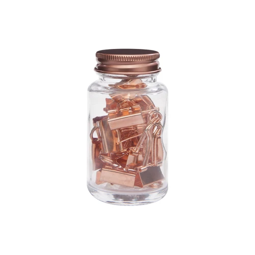 Ø 4,5 x 8,5 cm. Vidrio y metal. Set de sujeta papeles metálicos en frasco de vidrio con tapa metálica.