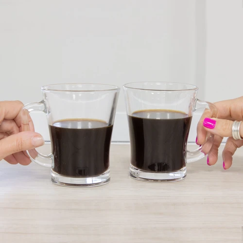 Disfruta cada sorboSet de 2 tazas de vidrio con asa, ideal para tomar bebidas calientes. Medidas: Ø 8 x 10 cm.