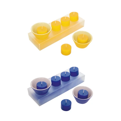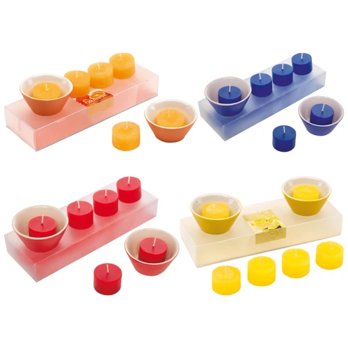 21,8 x 7,5 x 3,5 cm. Set de 6 velas de color y 2 portavelas de cerámica. Presentación en caja transparente de regalo.
