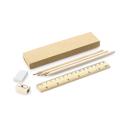 Set de 6 piezas con 3 lápices de madera con cuerpo redondo de acabado natural y mina negra, regla de 20cm con sistema métrico en centímetros/pulgadas, goma de borrar y sacapuntas. Presentado en estuche de cartón reciclado.
