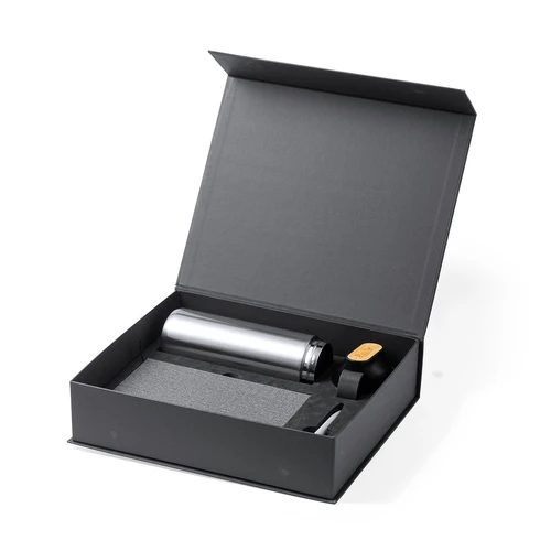 Elegante set premium que incluye: Termo de doble capa en acero inoxidable de acabado mate y de 640 ml de capacidad, con detalle de bambú en el tapón para marcaje. Bloc de notas en suave polipiel, con soporte para smartphone integrado en la portada y detalle en bambú para marcaje. Incluye cierre elástico, marcapáginas y soporte para bolígrafo a juego. Interior con 80 hojas de disposición a una raya. Bolígrafo en aluminio de acabado mate con detalle en bambú para marcaje, de mecanismo giratorio y tinta azul. Presentado en estuche individual de acabado mate y cierre magnético, con troquelado interior para cada uno de los elementos del set.