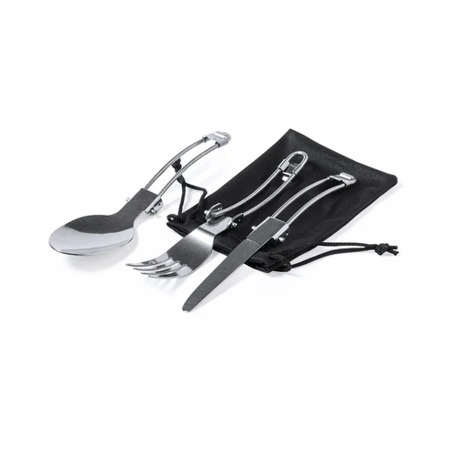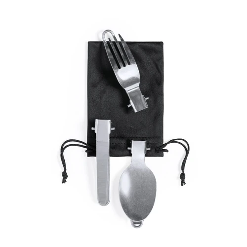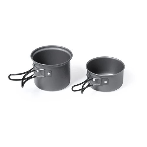 Completo set de menaje para camping de tamaño ultra compacto. Presentado en resistente funda de RPET con cierre de cordón, accesorio de ajuste y etiqueta exterior con distintivo RPET. Contenido:1 olla de aluminio acabado gris mate. 800 ml de capacidad 13 cm de diámetro x 10 cm de alto. Asas plegables con protección antiquemaduras.1 olla de aluminio acabado gris mate. 600 ml de capacidad 12 cm de diámetro x 6,5 cm de alto. Asas plegables con protección antiquemaduras.Cuchara, cuchillo y tenedor plegables fabricados en acero inox. Con mango troquelado y cierres de seguridad. Presentados en funda individual de RPET con cordones de cierre. El material RPET de las fundas se elabora a partir de plástico reciclado, para así fomentar la reutilización de residuos plásticos y ayudar a la sostenibilidad del planeta.