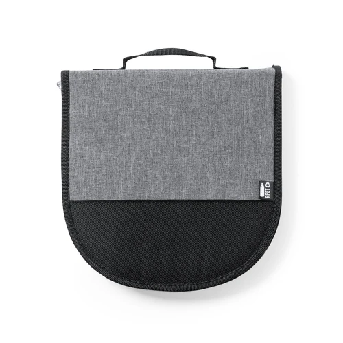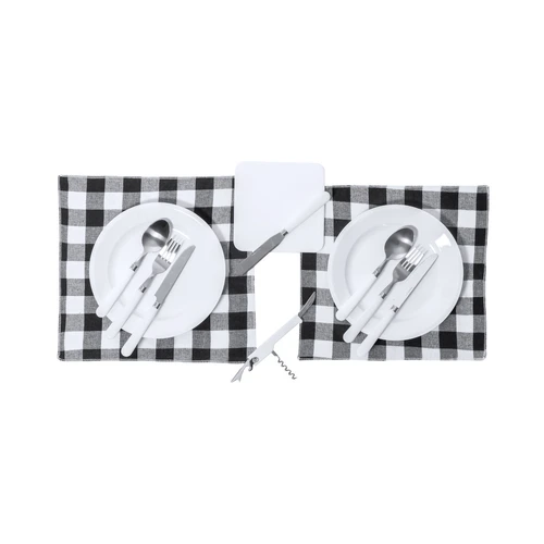 Original set de picnic de 2 servicios. Presentado en resistente funda 600D RPET, con cierre de cremallera, asa de transporte y etiqueta exterior con distintivo RPET. Interior reforzado, con compartimentos para los diferentes accesorios. Contenido: 2 cucharas, 2 cuchillos, 1 cuchillo de untar y 2 tenedores en acero inox con mango en PP blanco2 platos en PP blanco de 23 cm de diámetro.2 servilletas en tela de 29 x 29 cm. Con diseño retro en patrón a cuadros y en combinación tonos negros, grises y blancos.Tabla de corte y presentación de 15 x 15 cm, en PP blanco.El material RPET de la funda se elabora a partir de plástico reciclado, para así fomentar la reutilización de residuos plásticos y ayudar a la sostenibilidad del planeta.