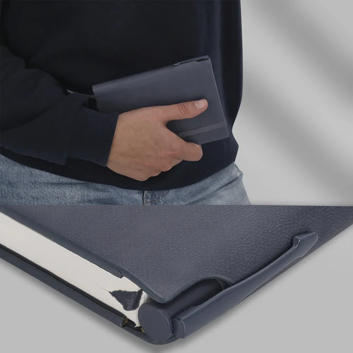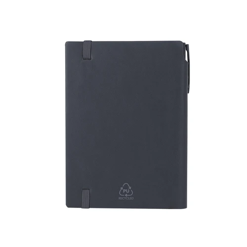 Set de bloc de notas y bolígrafo fabricados en PU reciclado y Aluminio Reciclado. El set incluye: - Bloc de notas fabricado en PU reciclada. Portadas rígidas, incluye 96 páginas de color crema, marcapáginas y cinta elástica de cierre a juego. Con distintivo logo PU reciclado. - Bolígrafo fabricado en Aluminio reciclado, con cuerpo en color sólido en acabado caucho. Dispone de clip, mecanismo pulsador y tinta azul. Incluye distintivo logo en Aluminio reciclado.El bloc dispone de un espacio para guardar el bolígrafo pudiendo llevarlo todo en un mismo sitio.