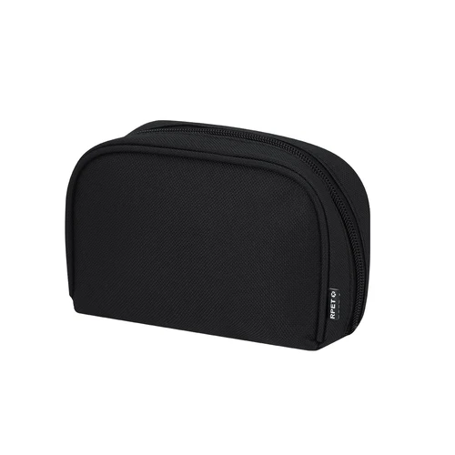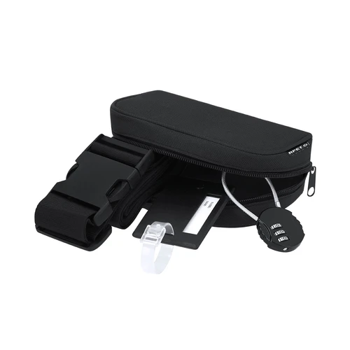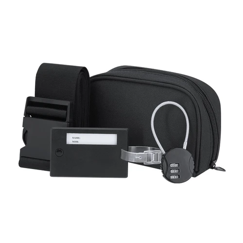 Set de viaje. Incluye: cinta ajustable para maletas, identificador de maletas y candado con contraseña numérica de 3 dígitos y cierre de cable de acero. Presentado en funda de RPET con cierre de cremallera y doble bolsillo interior. Incluye distintivo RPET.El material RPET se elabora a partir de plástico reciclado, para así fomentar la reutilización de residuos plásticos y ayudar a la sostenibilidad del planeta.