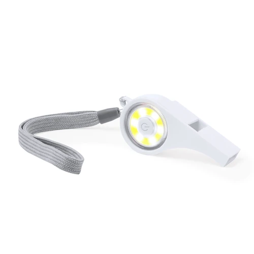 Ingenioso silbato multiusos con luz integrada en el cuerpo. Fabricado en resistente ABS, con 6 luces COB y varias posiciones de iluminación: fija con dos niveles de intensidad e intermitente para una mayor visibilidad. Cordón para un cómodo transporte y está alimentado por una pila de botón (incluida). Presentado en caja de diseño kraft.