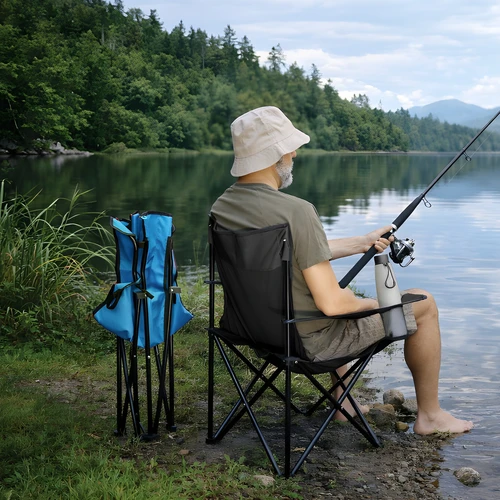 Comodidad lista para salir.Silla Camping Director plegable con apoyabrazos. Estructura con tubos de hierro. Asiento y apoyabrazos de poliéster600D con revestimiento de PVC y costuras reforzadas. Incluye red portabotellas color negro. Funda del mismo color con cierre ajustable y correa color negro para su mejor traslado.Medidas: 50 x 50 x 80 cm. (desplegada) 90 x 23 cm. (funda)