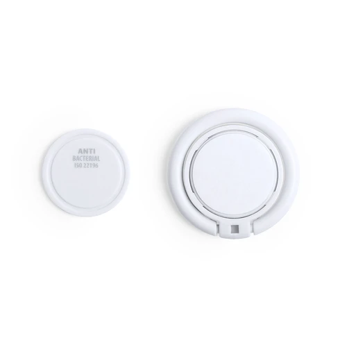 Soporte antibacteriano con adhesivo 3M extra fuerte. Ideal para smartphone, con moneda para carro integrada y anilla posterior 360º para el dedo, válida como soporte y accesorio para selfies.Los productos con tratamientos antibacterianos son capaces de reducir drásticamente las cargas bacterianas presentes en las superficies de los materiales, gracias a la incorporación de agentes microbianos permanentes estáticos, con alta efectividad para inhibir y prevenir la contaminación bacteriana.Artículo de acuerdo al estándar ISO 22196, que determina la actividad antibacteriana en materiales plásticos y superficies no porosas, lo que permite conocer la efectividad de inhibición microbiana que tienen los aditivos sobre los objetos tratados mediante una evaluación cuantitativa.