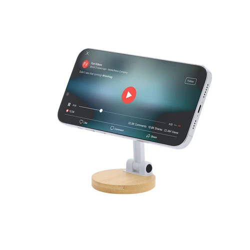 Soporte plegable para smartphones. Con fijación magnética, MagSafe y posición ajustable para mayor comodidad. Incluye anillo metálico adhesivo.Materiales como el bambú fomentan la utilización de materias primas naturales, reduciendo las emisiones contaminantes. Proviene de una planta de gran resistencia y versatilidad, con crecimiento y regeneración rápidos, siendo una excelente alternativa al uso de madera tradicional.