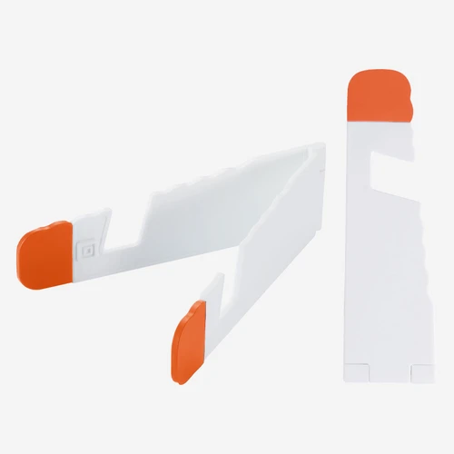 Soporte plástico abatible para iPad y Celular, con goma antideslizante en ambos terminales.