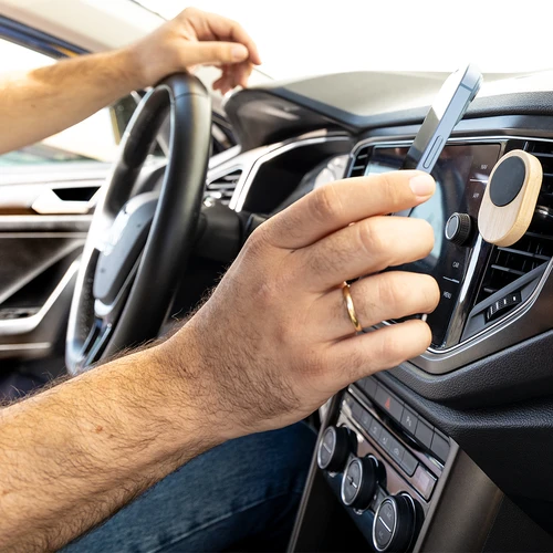 Soporte de rejilla de coche para smartphone fabricado en bambú. Cómoda y segura fijación magnética. Incluye anillo adhesivo. Presentado en caja individual de diseño eco en cartón kraft.Materiales como el bambú fomentan la utilización de materias primas naturales, reduciendo las emisiones contaminantes. Proviene de una planta de gran resistencia, con versatilidad de crecimiento y regeneración rápida, siendo una excelente alternativa al uso de madera tradicional.