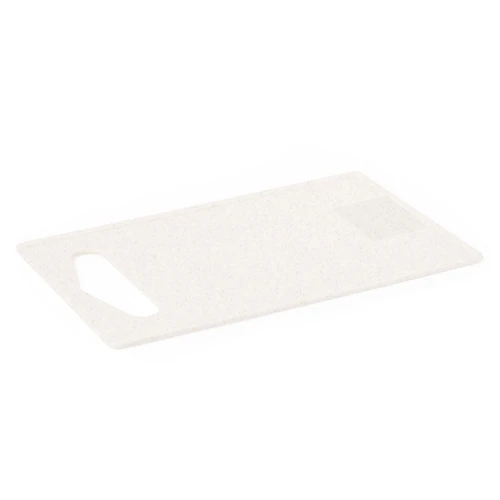 Tabla de cocina para cortar fabricada en PP. Con asa para un firme agarre, fácil de limpiar y guardar. Presentada individualmente bolsa reciclada.