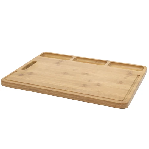 43 x 32 x 1.8 cm. Tabla de corte en Bambú. Tres compartimentos para armar botanas y llevarlas directo a la mesa. Transportable con manija incluida. Presentación en caja de regalo.