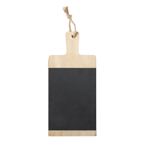 Tabla fabricada en combinación de materiales bambú y pizarra, de suave y resistente acabado pulido. Ideal para corte y presentación. Con asa para fácil manejo y cordón para colgar. Tabla de pizarra extraíble para fácil limpieza. Presentada en atractiva caja individual de diseño eco.