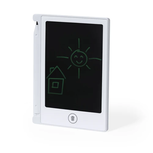 Tableta LCD para escritura en resistente material, con fijación magnética y soporte para el lápiz. Pantalla LCD de 4,5 pulgadas, con lápiz incluido, botón de borrado, bloqueo anti borrado y pila de botón incluida. Presentado en caja de diseño kraft.