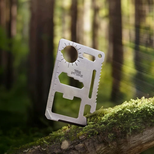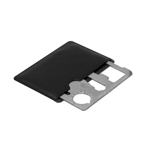 Prepárate para cualquier situación.Tarjeta multiherramienta de supervivencia portátil. Concentra 11 funciones en 1: abrelatas, cuchillo, destornillador plano, regla, abridor de botellas, llave inglesa de 4 posiciones, llave mariposa, llave inglesa de 2 posiciones, calibre de ángulos / indicador auxiliar de dirección para navegación / brújula auxiliar, sierra y orificio para cordón o llavero.Medidas: 7 x 4,5 x 1,7 cm.