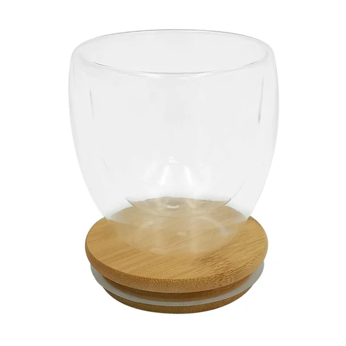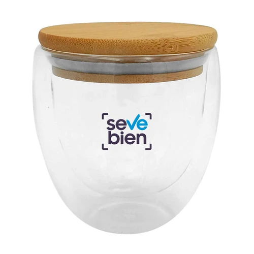Ø 9 x 9,5 cm. medida de la taza y Ø 9 medida de la tapa de bambú. Capacidad 250ml. Vidrio y Bambú. Taza de doble vidrio con tapa de bambú que ademas se puede utilizar como posa taza/vaso. No pasa el calor. Apto para lavavajillas (únicamente la taza) . Presentación en caja de regalo Kraft.