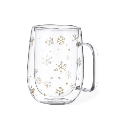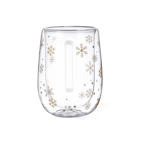 Taza térmica de doble pared y 400 ml de capacidad. Con original diseño de copos de nieve y área de marcaje especial en el frontal. Fabricada en cristal de borosilicato, que ofrece una resistencia y durabilidad excepcionales, alargando su vida útil y pudiendo ser reutilizada infinidad de veces.Presentada en caja de diseño en color negro con ilustración en color dorado.