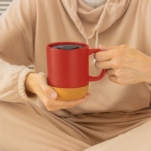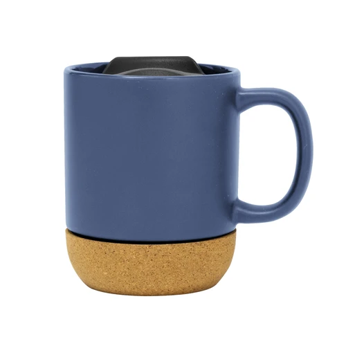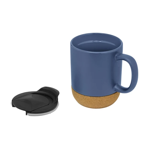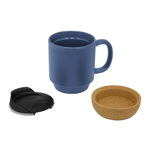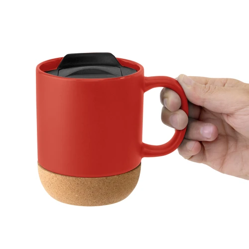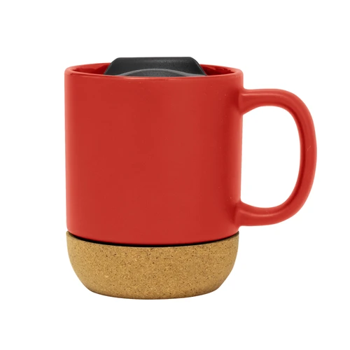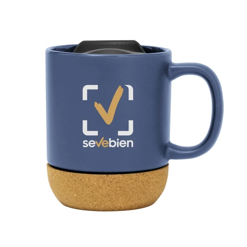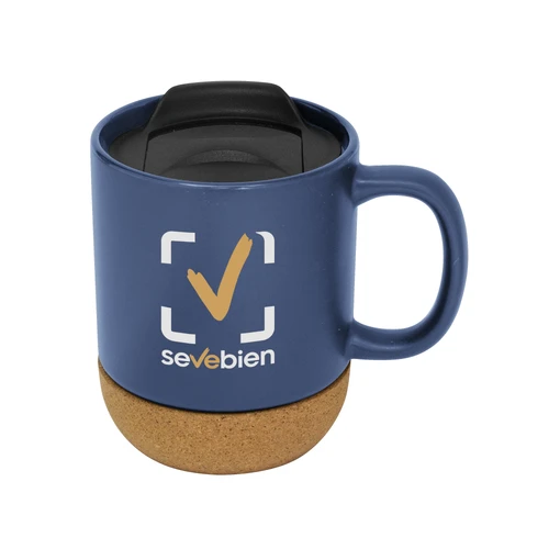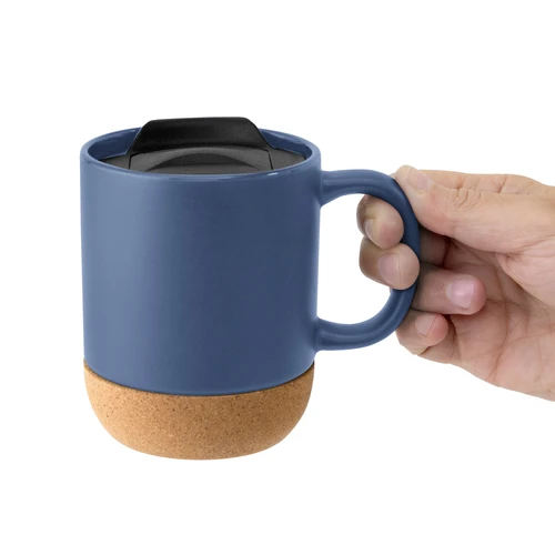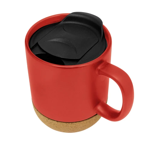 Práctica y elegante.Taza con tapa. Tapa plástica a presión color negro con anillo de silicona. Base de corcho. Pintura con acabado mate. Producto apto para microondas siempre retirando la base de corcho. Medidas: 11,8 x 9,3 x 11,5 cm.