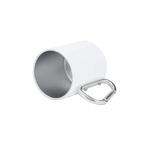 Taza de acero inox de 220ml, con cuerpo de acabado blanco brillante metálico y una funcional asa en forma de mosquetón pudiendo ser fácil de transportar. Especialmente diseñada para la sublimación.