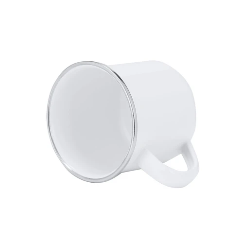 Taza metálica de 200ml de capacidad con diseño vintage y acabado blanco brillante con elegante detalle en cromado en el borde. Diseñada especialmente para la sublimación.